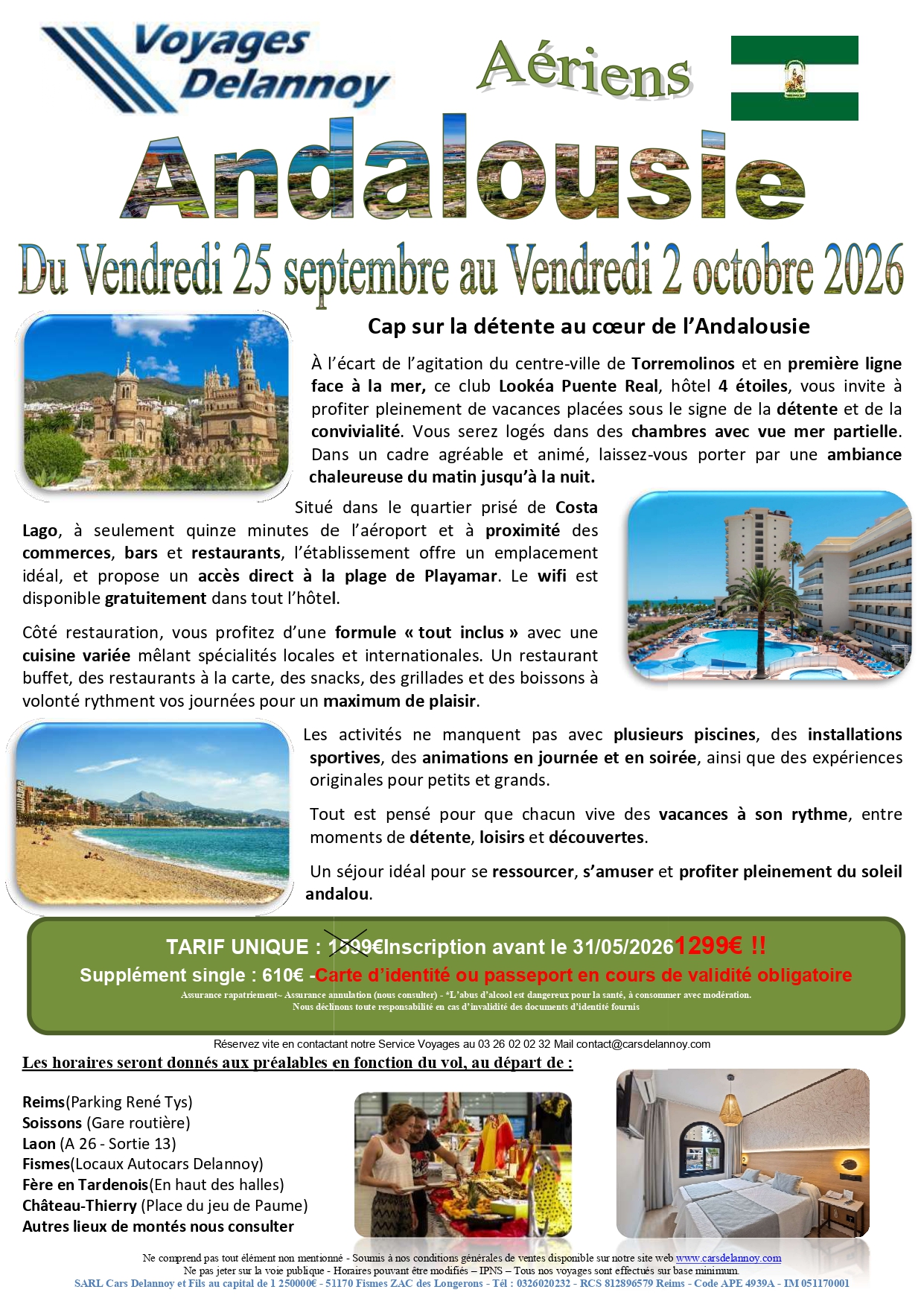 Ne comprend pas tout élément non mentionné - Soumis à nos conditions générales de ventes - Horaires pouvant être modifiés - Assurance rapatriement: 29,00 € / personne (précisez si vous refusez) ~ Assurance annulation (voir bulletin d’inscription)- *L’abus d’alcool est dangereux pour la santé, à consommer avec modération.