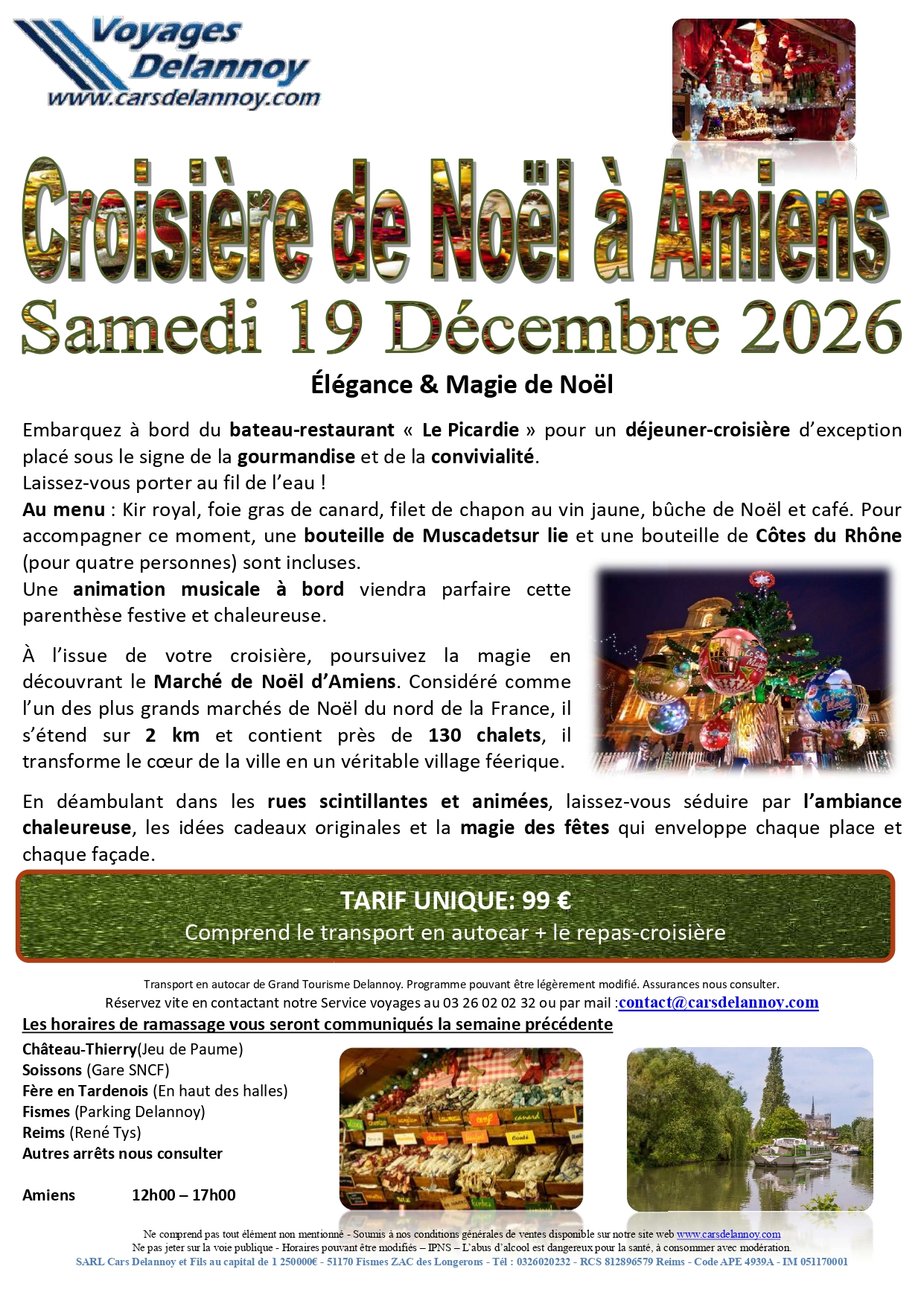 À l’issue de votre croisière, poursuivez la magie en découvrant le Marché de Noël d’Amiens. Considéré comme l’un des plus grands marchés de Noël du nord de la France, il s’étend sur 2 km et contient près de 130 chalets, il transforme le cœur de la ville en un véritable village féerique.